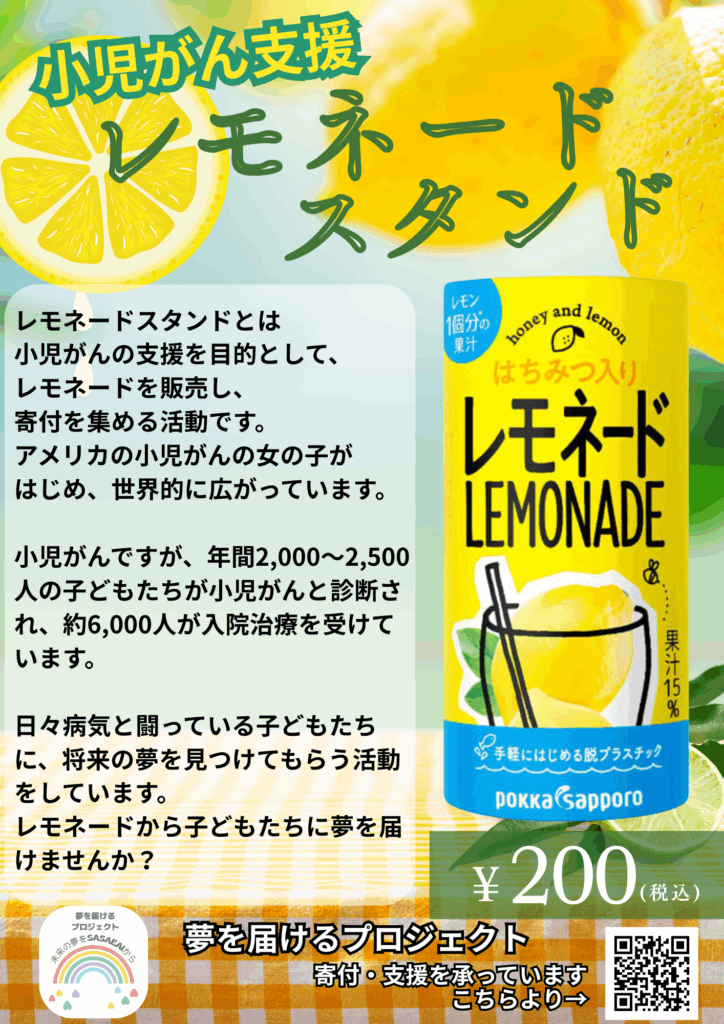 一人でも多くの患者さん、ご家族の支援になればと思い、作品展会場にてレモネードスタンド(募金活動)をさせていただきます。